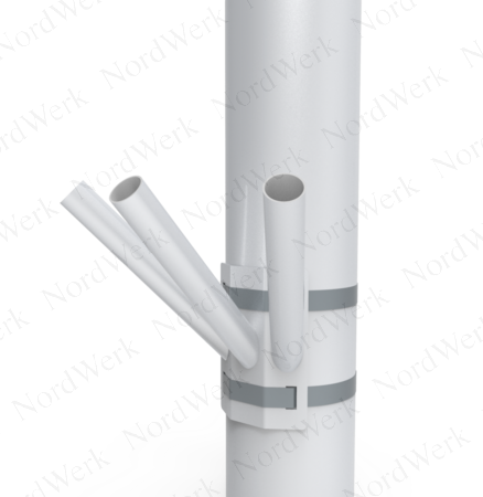 Стальной кронштейн для крепления к опоре, 3 древка L=950 мм из усиленной алюминиевой трубы с пластиковой заглушкой, 2 стальные бандажные полосы с замком крепления на опорах.